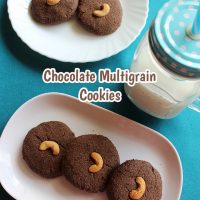 These chocolate multigrain cookies are very crumbly and mildly sweet, being sweetened with dry dates powder But and made from 100% natural Choco Multigrain Health Drink Mix! If you want the cookies to be firmer, use half the quantity of whole wheat flour and half of the multigrain health mix. With ingredients like Barnyard Millet, Finger Millet, Foxtail Millet, Kodo Millet, Little Millet, pearl Millet, Sorghum, Corn Sago, Horsegram, Sesame seeds, Almonds, Pistachios, Cashew nuts and Cocoa powder, these cookies have got to be the ultimate cookie recipe in the universe!