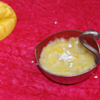 This Mango oats porridge for babies recipe is rich in vitamins and minerals! It’s made yummy with the juicy and pulpy mango fruit. This recipe is definitely a good filling breakfast, as it has the fiber rich oats in it. Oats is a best weight gain food for babies. Rolled oats are easier to cook, taking only a few minutes and result in a smooth, soft texture, since they hold more moisture. It’s a rich source of manganese, phosphorous, copper, vitamin B1, iron, zinc etc. Mango is a low-calorie fruit, which is rich in fiber, vitamin A, C etc. It’s highly nutritious and also adds a natural sweetness to the recipe. The sweet smell of the creamy mango “the king of fruits”, makes this recipe even more convincing for babies.