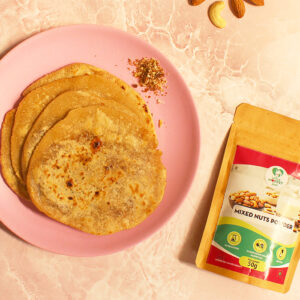 Mixed Nuts Paratha for Kids is a yummy, easy and home-made sweet paratha for toddlers to adults. It’s perfect for all the kids who are in love with sweet taste. It’s also an ideal accompaniment to any party or special occasion in your family. Mixed Nuts Paratha for Kids (Easy Homemade Sweet Paratha for Kids) is filled with the goodness of mixed nuts. Mixed nuts powder is made by blending different types of healthy nuts together. We have used the mixed nuts powder of My little moppet foods which is free from preservatives or additive and it’s made fresh with every order. Nuts are loaded with many essential nutrients. They are loaded with antioxidants, vitamin E, magnesium, selenium, fiber etc. Paratas made with whole wheat is the best. Using whole wheat instead of maida, makes it a guilt free healthy recipe. This recipe is suitable for babies above 1 year.